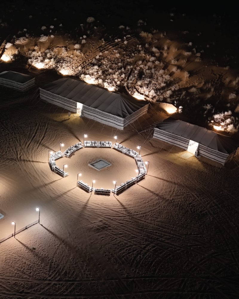 مخيم ملكي أنيق يتّسع لأكثر من 200 شخص، يوفر مساحة مثالية للفعاليات الخاصة والتجمعات الراقية وسط أجواء الرمال الحمراء المميزة.