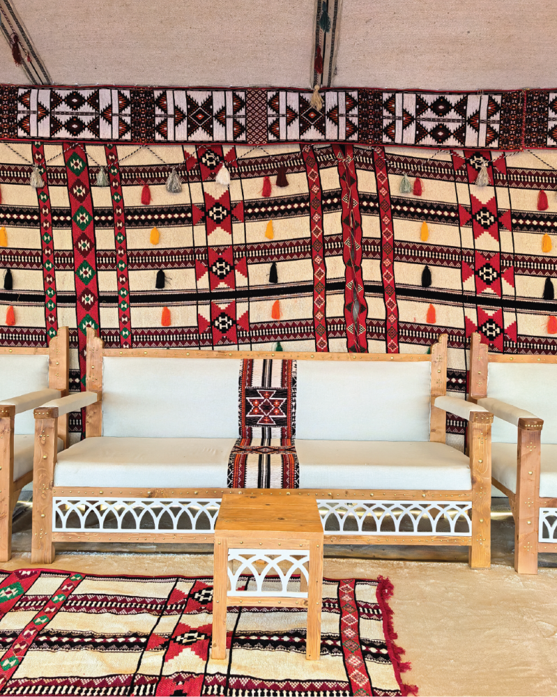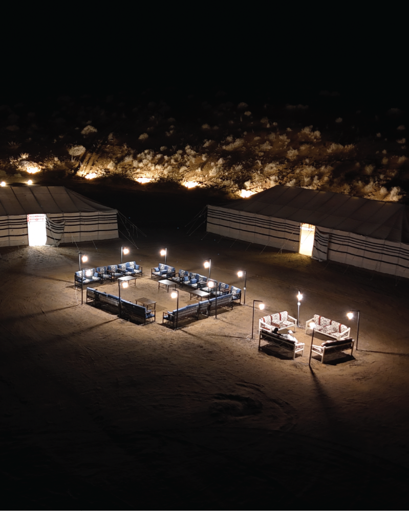 The Camp Includes: 2 Bayt Sha'ar (tent/majlis), a tent, a kitchen, 2 outdoor seating areas, a Jaccaro table, and a fire pit (Mashab Nar).