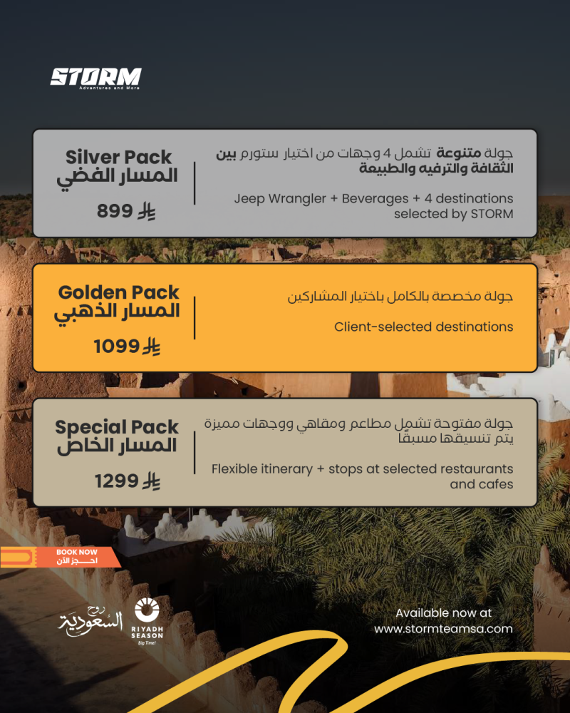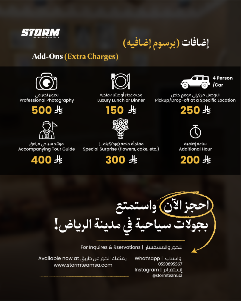 عيش تجربة ميدانية استثنائية داخل مدينة الرياض، واستكشف أجمل الوجهات السياحية، الترفيهية، الثقافية، والبيئية من خلال جولات منظمة بسيارات جيب رانجلر مجهزة بالكامل، مع سائقين محترفين وتجهيزات متكاملة، وتنوع في المسارات والبرامج حسب ذوق العميل.